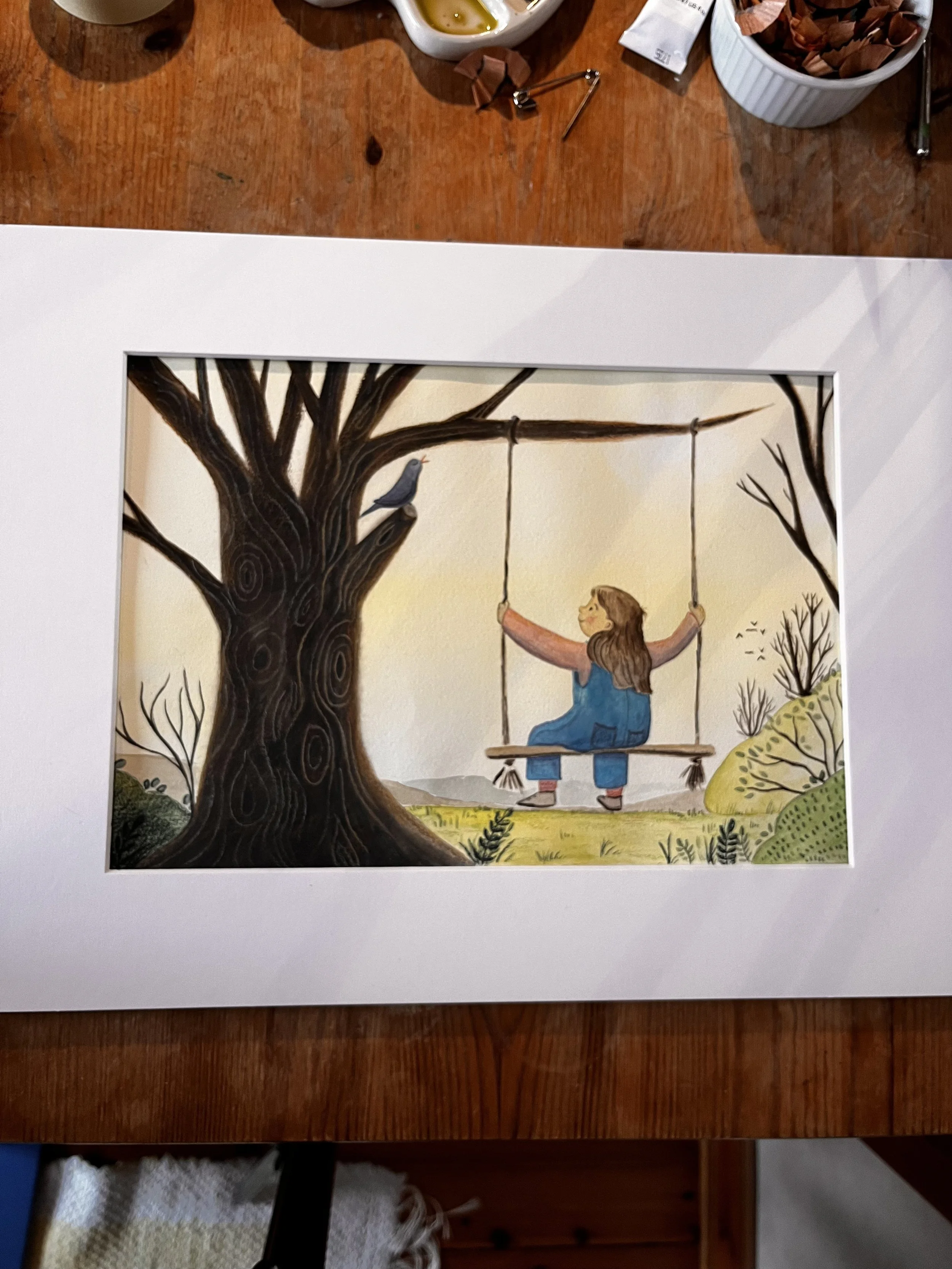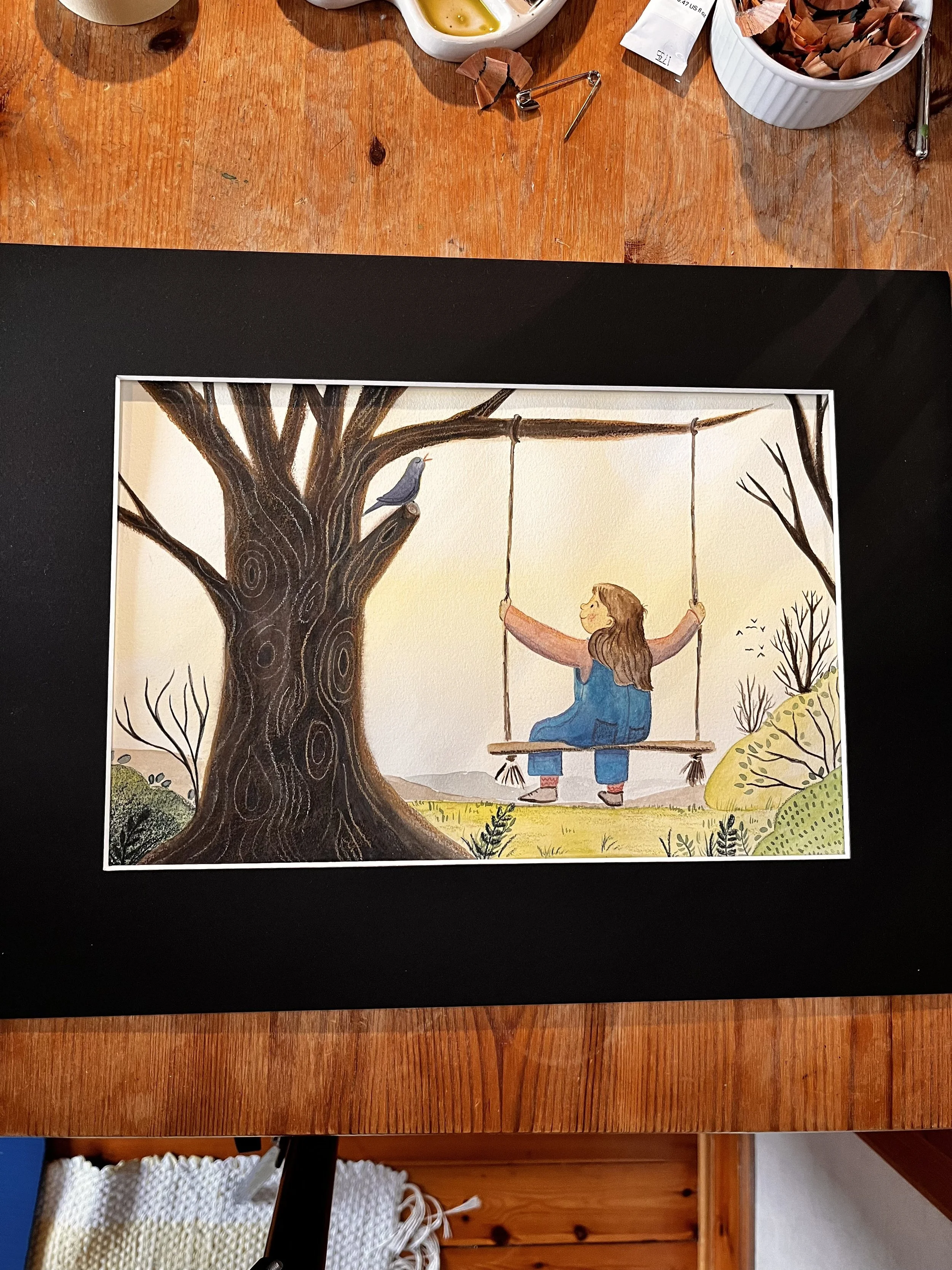 Jenta og fuglen er opprinnelig inspirert av en fin vårdag i hagen med fuglesang og lek. Jeg har brukt akvarellfarger og fargeblyanter, alt i kunstnerkvalitet og i A4 størrelse. Bildet er ikke behandlet/fiksert på noen måte, og blir levert uten passepartout. Sendes i hele Norge. Frakt kommer i tillegg til prisen. For å kjøpe bildet, fyll ut kontaktskjemaet under, og jeg svarer deg så snart som mulig. Den første som tar kontakt får kjøpe bildet.