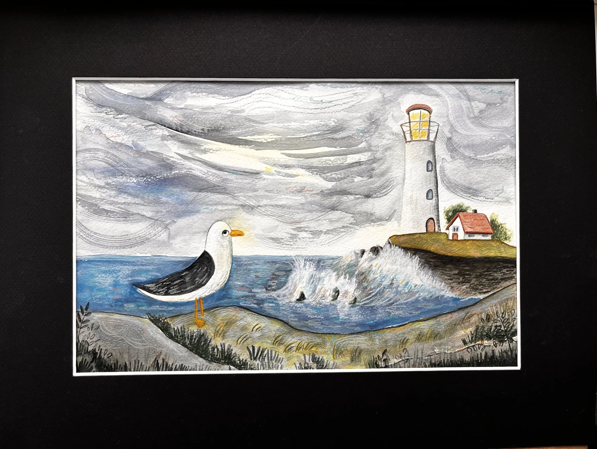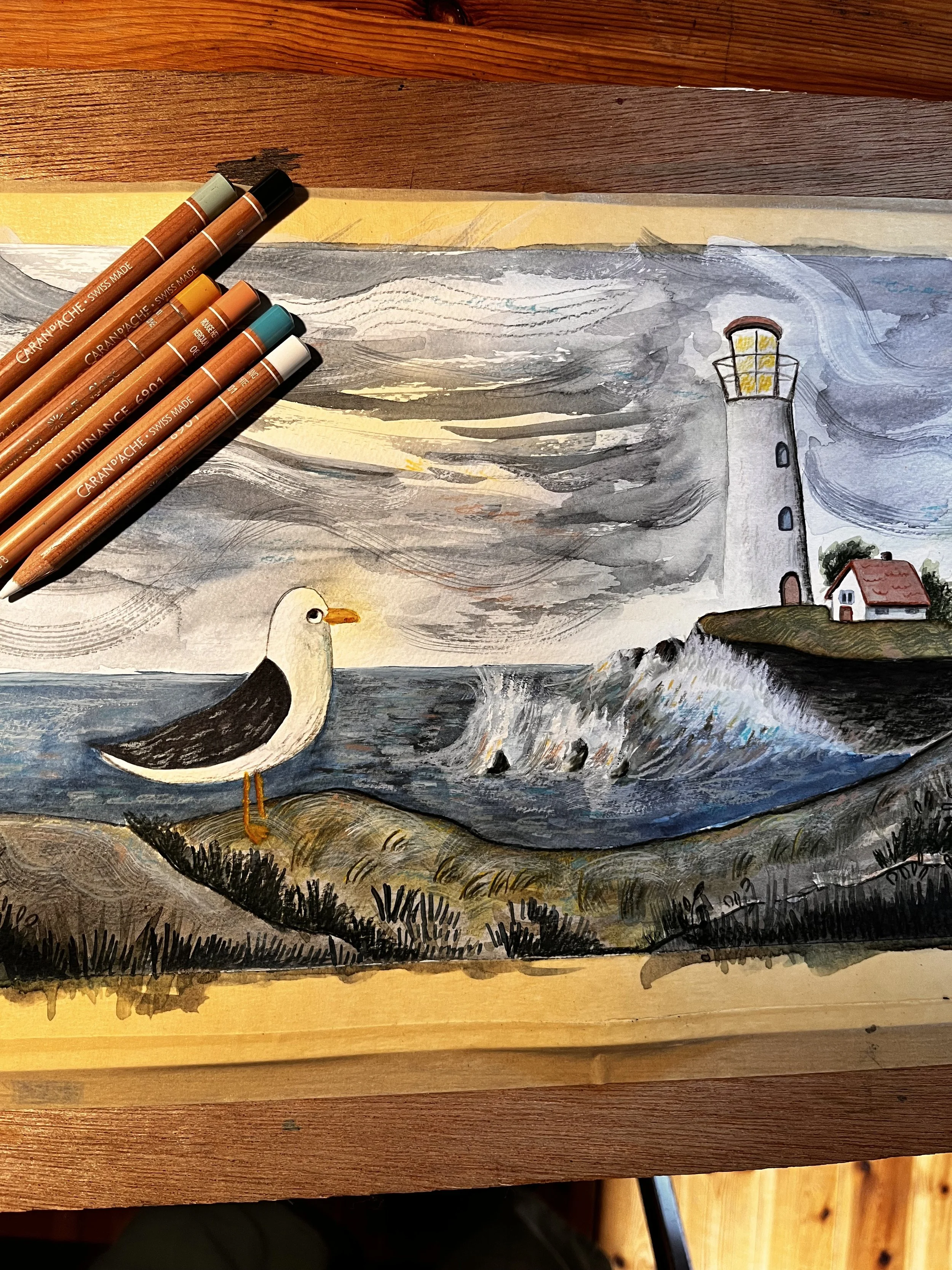 “Fyrtårn” er en illustrasjon der jeg har brukt akvarellmaling og fargeblyanter. Bildet måler omtrent 20x30 cm og blir levert uten ramme eller passepartout.