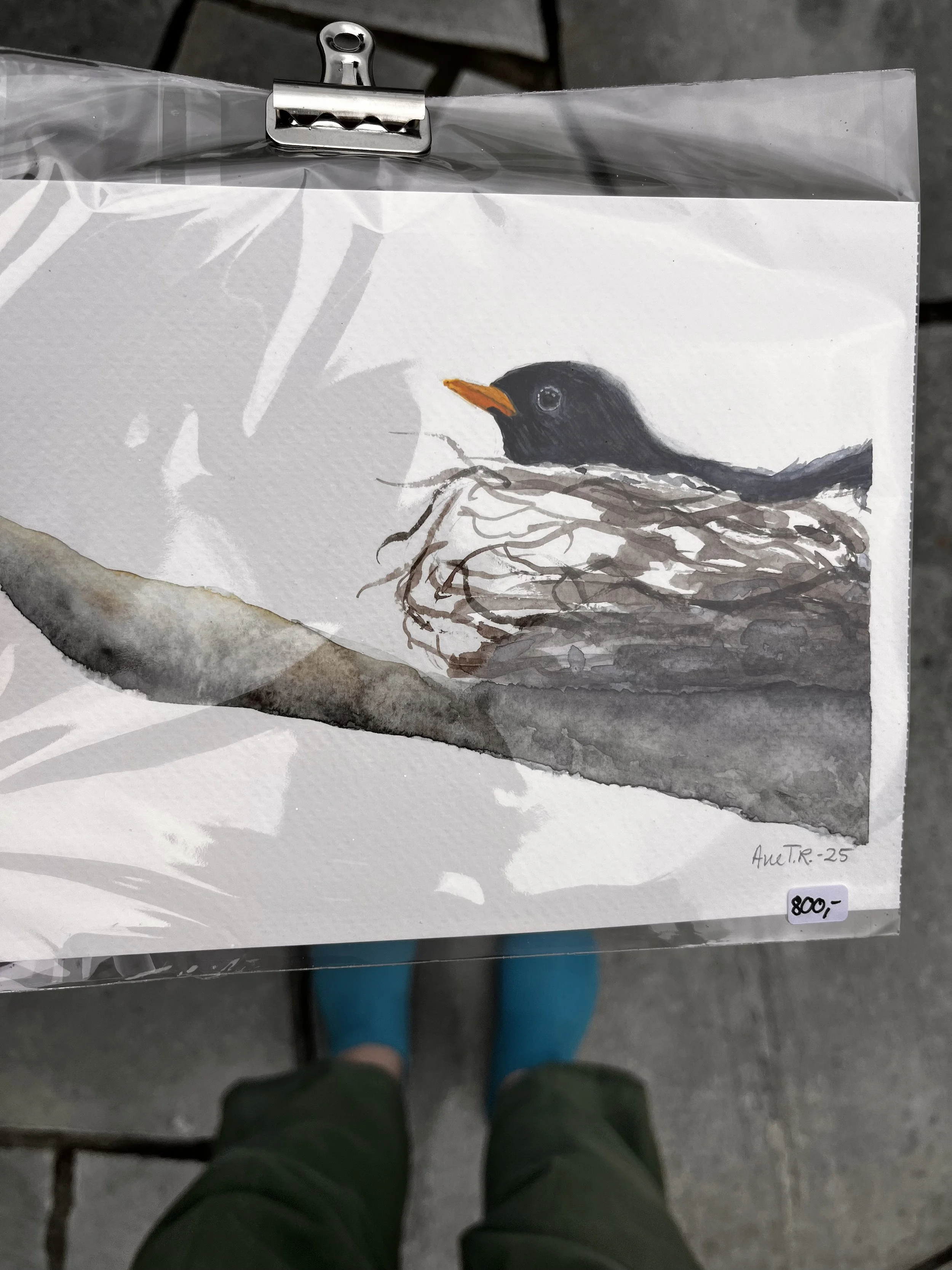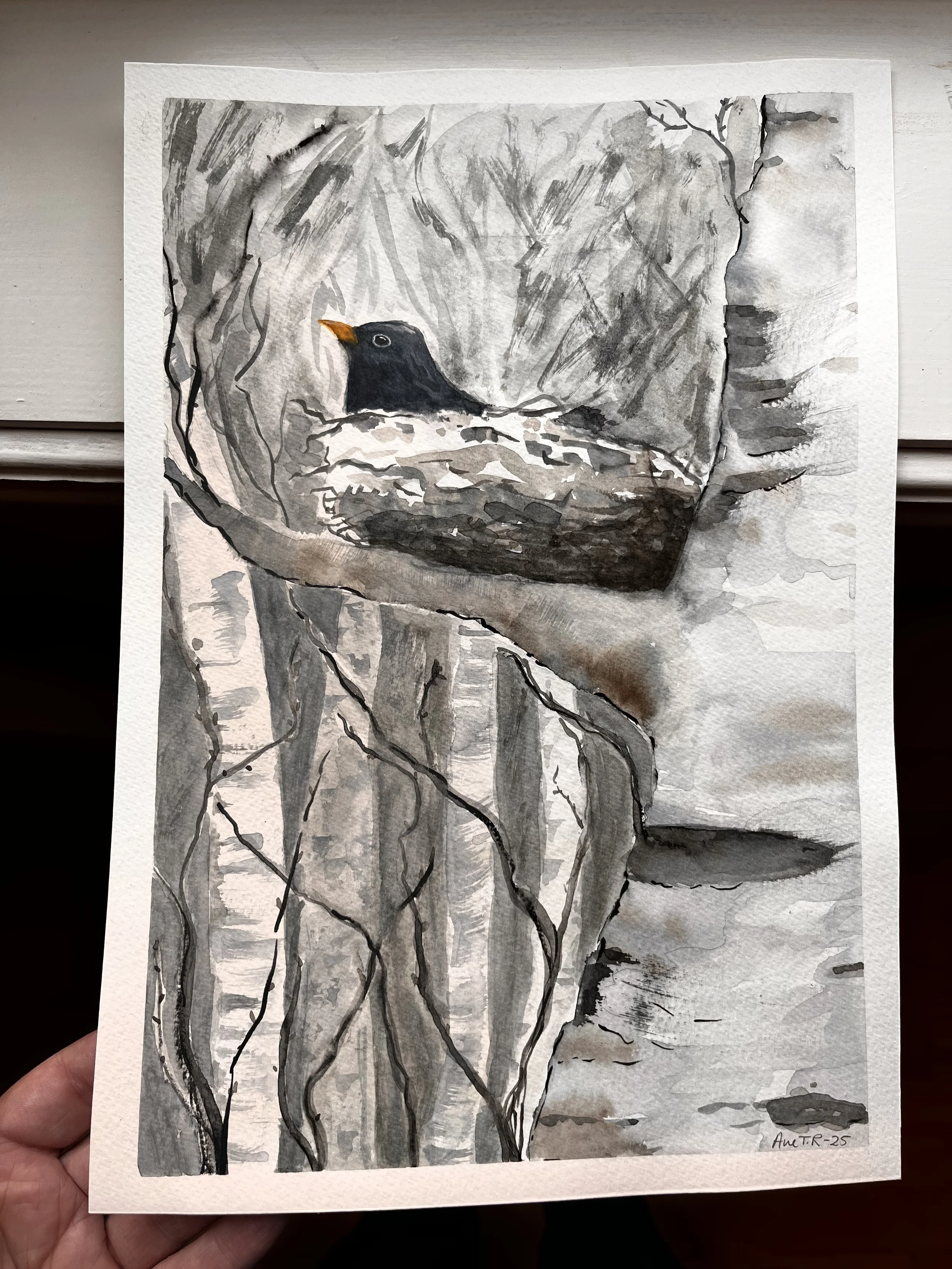 Fugl i bjørkeskog ble til en tidlig og grå vårdag. Maleriet er malt med akvarellfarger i kunstnerkvalitet på kaldpresset, syrefritt akvarellpapir. Bildet er i A4 størrelse og er en original. Maleriet er ikke behandlet/fiksert på noen måte, og blir levert uten passepartout/ramme. Sendes i hele Norge. Frakt kommer i tillegg til prisen. For å kjøpe bildet, fyll ut kontaktskjemaet under, og jeg svarer deg så snart som mulig. Den første som tar kontakt får kjøpe bildet.
