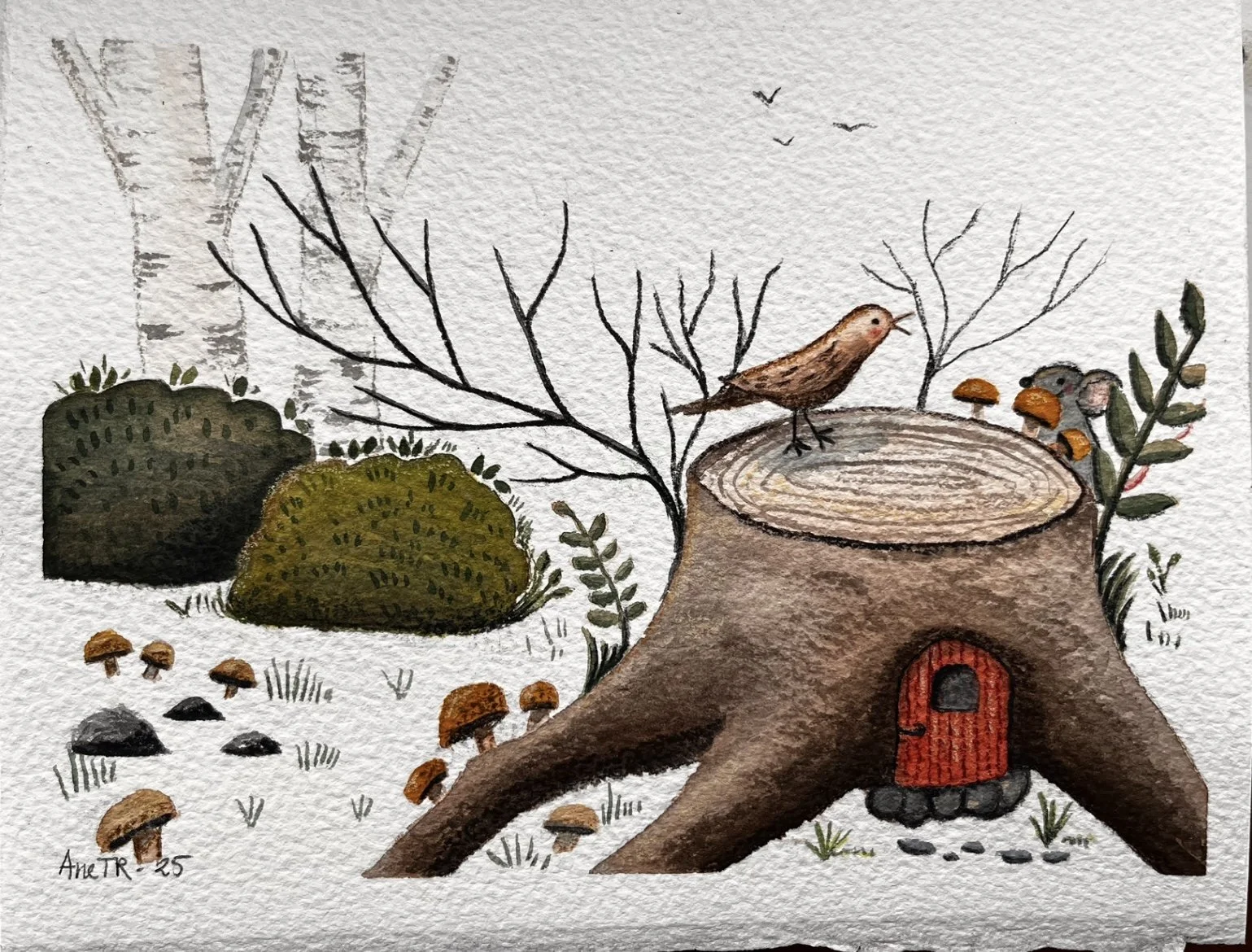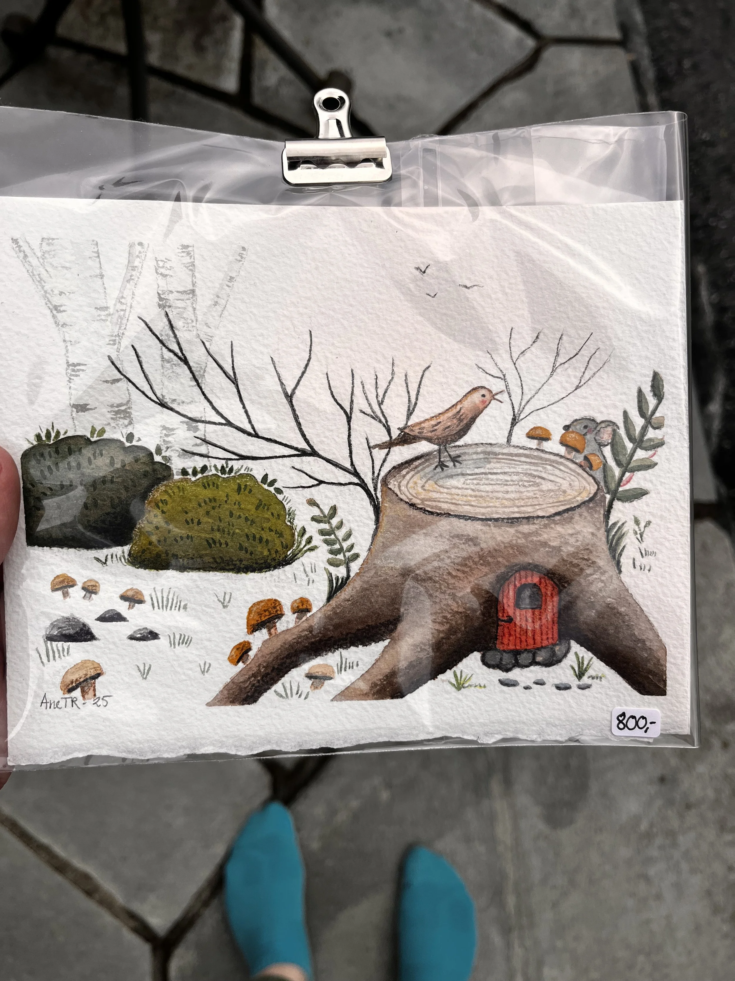 “Møte i skogen” er en illustrasjon der jeg har brukt akvarellmaling og fargeblyanter. Bildet måler omtrent 18x13 cm og blir levert uten ramme eller passepartout.